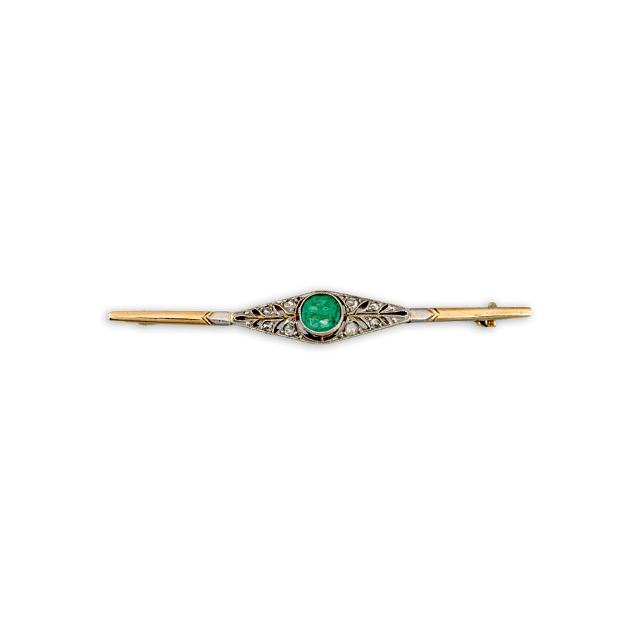 20. sz. második fele, 1999 utáni budapesti behozatali jellel, 14 k arany, ezüsttel lemezelt fejben 1 db kerek csiszolású smaragd és 8 db gyémánt, kis sérüléssel, 4 g; h: 5, 8 cm