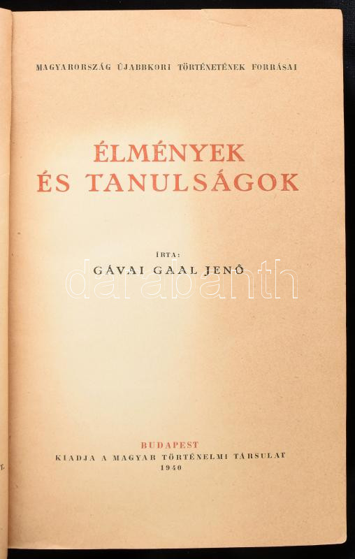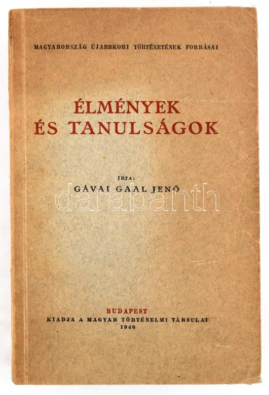 Gávai Gaal Jenő: Élmények és tanulságok. Magyarország újabbkori történetének forrásai. Bp., 1940, Magyar Történelmi Társulat. Kiadói papírkötés, gerinc kissé sérült, kissé kopottas állapotban. Gávai Gaal Jenő (1846-1934) közgazdász, műegyetemi tanár, MTA tagja, politikus, a közgazdaság-tudományok tiszteletbeli doktora. Gávai Gaal Jenő a magyar-román határmegállapítás.1922-ben a magyar-román határmegállapítás ügye miatt járt a Határmegállapító Központban, és felkutatott minden forrást, hogy a magyar érdekeket támogassa. Angol nyelven elkészítette az Arad megyére vonatkozó emlékiratát, melyeknek kinyomatott példányait bel- és külföldre is elküldte. Amikor arról értesült, hogy a románok Gesztet, Artándot, Biharkeresztest, sőt Arad megyében Eleket és vele Lőkösházát is meg akarják szerezni, akciót indított, hogy a nemzetközi bizottság francia, angol, olasz és japán tagjait meggyőzze a követelés jogtalanságáról. 1922. február 21-én Biharkeresztesre, és onnan Nagyváradra rendelte a nemzetközi döntőbizottság. Hófúvások miatt, családja kérésére lemondott az utazásról. Végül februári 27-én indult útnak és utazott le Aradra, ahová a nemzetközi bizottság egy nappal korábban különvonaton érkezett meg. Bár hivatalos határátlépési engedélyt nem kapott, és sem a román, sem a magyar határőrizeti szervek nem tudtak érkezéséről, végül részt tudott venni, a bizottság február 28-án megtartott ülésén. „A japáni őrnagyot kivéve, mindegyikkel saját nyelvén beszéltem. Az elnöknél nem mulasztottam el felemlíteni, hogy Millerand francia köztársasági elnökkel, sőt feleségével is ismerős vagyok, mert velők Svájcban és Budapesten, amott vagy ötször, találkoztam. Az angol delegátus megtudta, hogy tagja vagyok a Royal Economic Societynak és a new yorki Akademy of Political Science-nak. Az olasz és oláh ezredeseknél is találtam valamit, ami bebizonyította, hogy országaikban nem vagyok járatlan. A kihallgattatás a bizottság formaszerű ülésében történt, melynek megnyitása után az elnök nekem adta a szót. Egy órában állapították meg francia előadásom időtartamát. Az alatt senki sem szólt közbe. Utána sem intéztek hozzám kérdéseket. Az igaz, hogy az adott keretben, melyet a magyar biztos közölt velem, minden felmerülhető ellenvetésre előzetesen igyekeztem megfelelni” – írta emlékirataiban Gaal Jenő. A románok az eleki járást, Eleket, a 22 ezer hold területű Lőkösházának több, mint felét, valamint a vasútállomást is követelték. Gaal Jenő emlékiratokat, adatgyűjteményeket és térképeket bocsátott a delegáció rendelkezésére, melyek a román fél adatait megcáfoltak. Végül 1922. augusztus 28-án Budapesten Magyarország javára dőlt el a kérdés. Közbenjárásának köszönhető, hogy Lőkösházát, Eleket, Gesztet, Ártándot és Biharkeresztest nem csatolták el Magyarországtól.