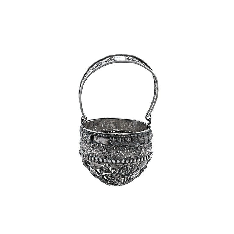 osztrák (?), 19. sz. közepe, antik ezüst, domborított, poncolt, levelekkel rózsákkal, szőlőindákkal díszítve, levélkoszorú hiányos, alsó csüngő hiányzik, 60 g; h: 13,5 cm
