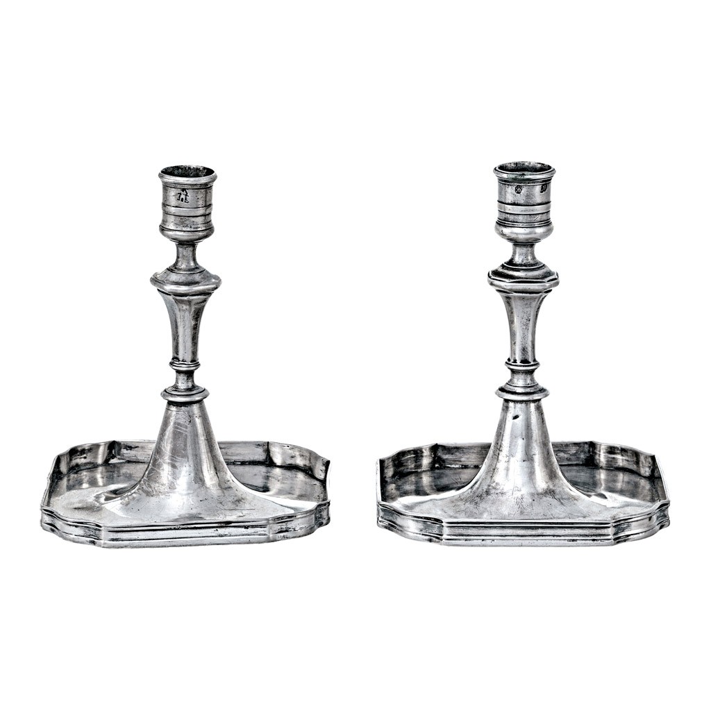 Bécs, 1770 körül, antik ezüst, Lorenz Höbert (?) mesterjegy, négyzetes emelt peremű talpon, vékony szár, sima gyűrűs gyertyacsészékkel, kis sérüléssel, Neuwirth P 1844