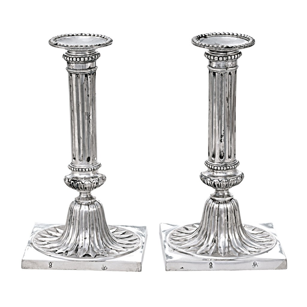Augsburg, 1781-1783, antik ezüst, Johann Christian Neuß mesterjegy, kalapált, négyzetes talp, domborított, poncolással kiemelt lándzsalevél koszorúval, oszlopos szárral, gyöngysor dísszel és, kivehető gyertyacsészékkel, kis sérüléssel, Rosenberg 3. Nr 278
