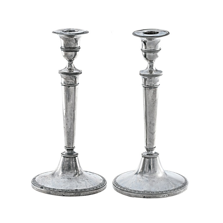 Itália, 19. sz., antik ezüst, fa talpkoronggal, fém belsőösszekötő szárral, kerek talpon hengerelt palmettás díszszegély, gyertyacsészék kivehető szűkítőkkel, kis sérüléssel, Rosenberg 3 Nr. 7327 városjegy nem feloldott, cca. Ntto.: 560 g; m: 23 cm