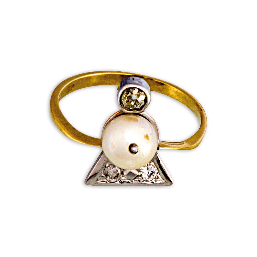 20. sz. második fele, 2016 utáni budapesti fémjellel ellátva, 14 k sárga és fehérarany, 1 db régi és 2 db fél modern csiszolású briliánssal cca. 0, 25 ct (M2-R1, TCr-VLY, VS-P1) és 1 db fehér akoya, gyönggyel, apró sérüléssel, 2, 6 g