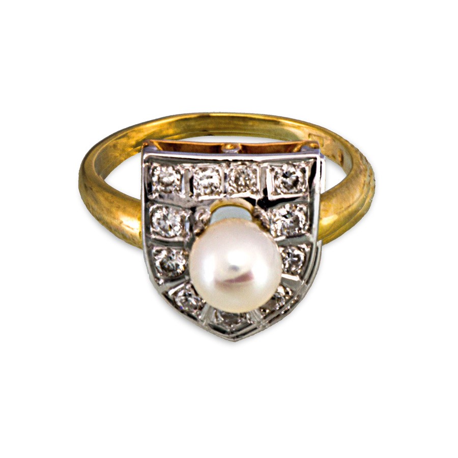 20. sz. második fele, 2016 utáni budapesti fémjellel ellátva, 14 k sárgaarany, fehérarannyal lemezelt pajzs formában 1 db tenyésztett akoya gyöngy és 11 db modern csiszolású briliáns cca. 0, 4 ct, (M1, W-TCr, VS-P2), kis sérüléssel, 4, 4 g