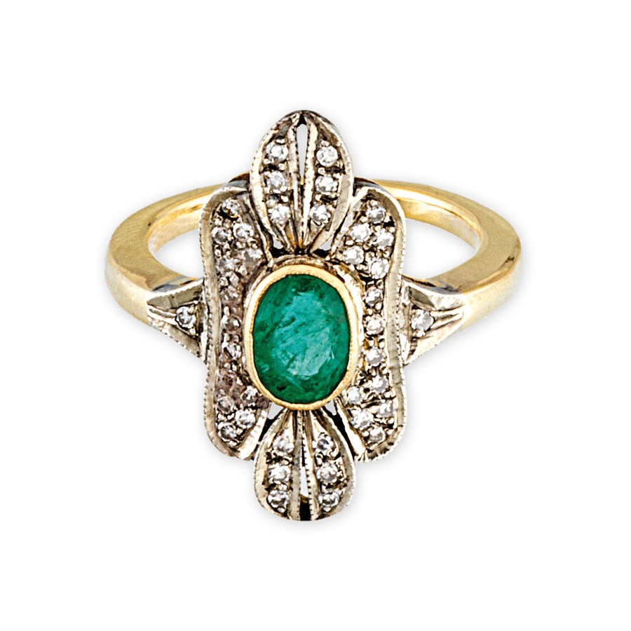 orosz, 1926 előtti szovjet fémjel, 2016 utáni budapesti fémjellel ellátva, 18 k arany, ezüsttel lemezelt felső lapon 1 db élénk zöld smaragd és 39 db achtkant csiszolású, gyémánt, apró sérüléssel, 6 g