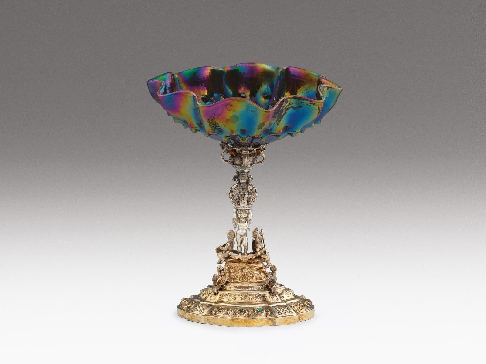 Aranyozott ezüst, 688 g. Lépcsőzetes, historizáló díszítmények között türkiz kövekkel és gyöngyökkel ékített ovális talapzaton, a tudomány és hadviselés allegóriái között, öntött és cizellált szárnyas puttó alakja. Kezeiben maszkaróné