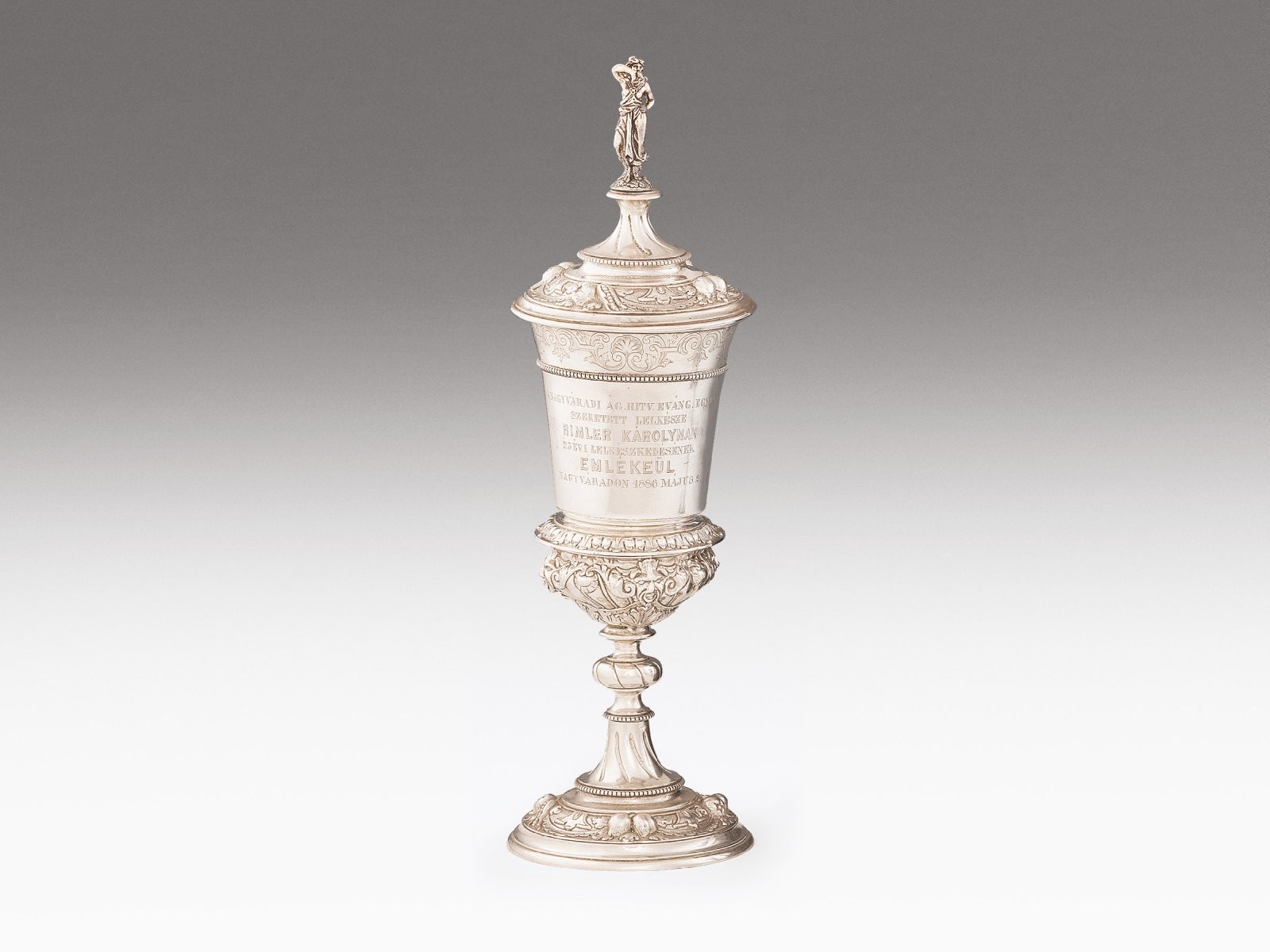 Historizáló fedeles kehely Ezüst, 518 g. belül aranyozva. Lépcsőzetes kerek talpon többszörösen tagolt szár, rajta domborított, poncolt és cizellált maszkarónékkal és akantuszlevelekkel díszített foglalat, sima vonalú, csigavonalakkal és legye