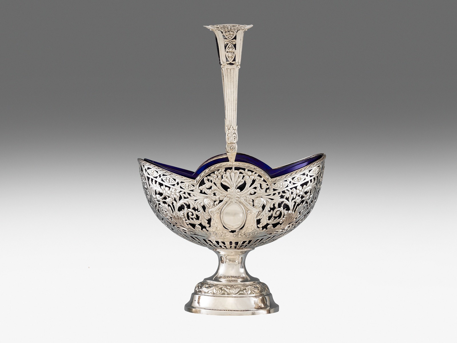 Historizáló füleskosár. Ezüst, 644 g. Boltozatos ovális talpon csónak formájú tál, oldalán áttört mintás billenthető fogóval. A tál egész felületén áttört díszítmények: két nőalak, kezükben medalionnal, körülöttük növényi ornamentika. Belsejében fúvott és