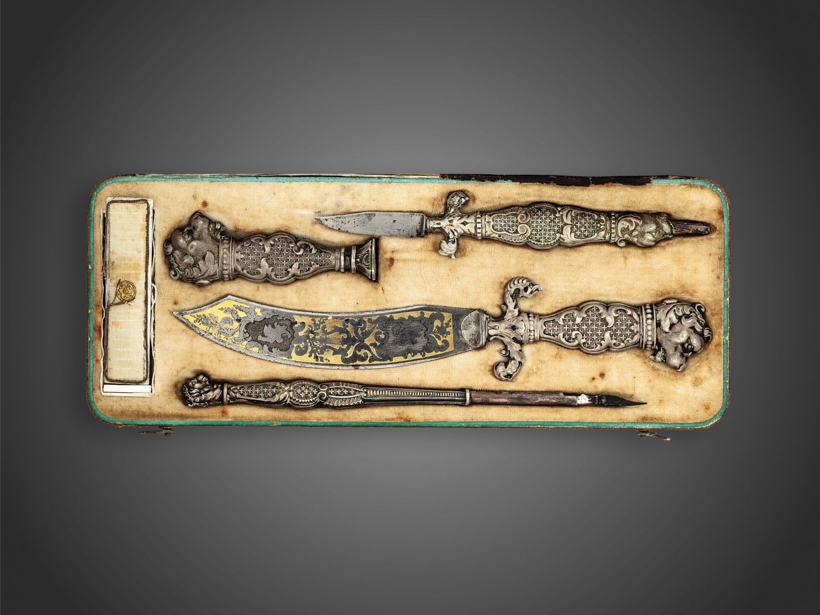 Ezüst, bruttó 70 g. 5 darabos (tollszár, 2 darab papírvágó kés, pecsétnyomó és tollhegytartó) készlet, bőr borítású bársonnyal és selyemmel bélelt eredeti tokjában. Jelzetlen, XIX. század. M.: 23,5 × 9 cm