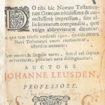 Johannes Leusden (1624-1699): He Kaine Diatheke = Novum testamentum cum versione Latina Ariae Montani, in quo tum selecti versiculi 1900, quibus omnes Novi Testamenti voces continentur, astericis notantur; … Amstelaedami [Amsterdam], 1698, Ex Officiana Westeniana, 1 (díszcímlap) t. +6+666 p.+ 1 (Loca terrae sanctae quorum sit mentio in Evangeliis, hiányos 12×11,5 cm) t. Görög és latin nyelven. Korabeli egészbőr-kötés, kopott borítóval, sérült, hiányos gerinccel, sérült díszcímlappal és hiányos címlappal, két helyen javítással, foltos lapokkal, aláhúzásokkal és néhány bejegyzéssel, a díszcímlap hátoldalán és az utolsó lapon bejegyzésekkel, hiányos