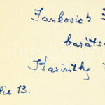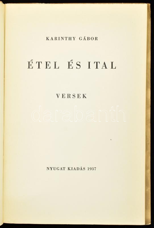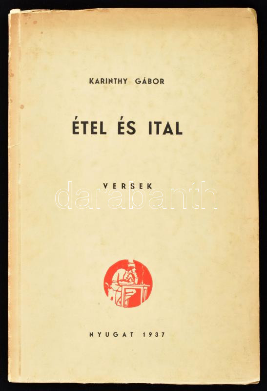 Karinthy Gábor: Étel és ital. Versek. A szerző, Karinthy Gábor (1914-1974) költő által Jankovich Ferenc (1907-1971) Kossuth-, József Attila- és Baumgarten-díjas költő, író, műfordító részére DEDIKÁLT, dátumozott (1938. április. 13.) példány. Bp., 1937, Nyugat,(Haas Ottó-ny.), 76+2 p. Első kiadás. Kiadói papírkötés. Karinthy Gábor (1914-1974) Karinthy Frigyes idősebb fia, Karinthy Ferenc író testvére. Kiváló tehetsége korán megmutatkozott. Barátjával, Devecseri Gáborral 18 évesen verseskötete jelent meg. De kiteljesedni nem tudott, betegsége, skizofréniája egyre jobban elhatalmasodott rajta. Később aztán idegszanatóriumba is került. Barátja, az író Benedek István volt a kezelőorvosa. 1957-től visszavonultan élt. 2019-ben gyűjteményes kötet jelent meg írásaiból, benne számos eddig kiadatlan művével.