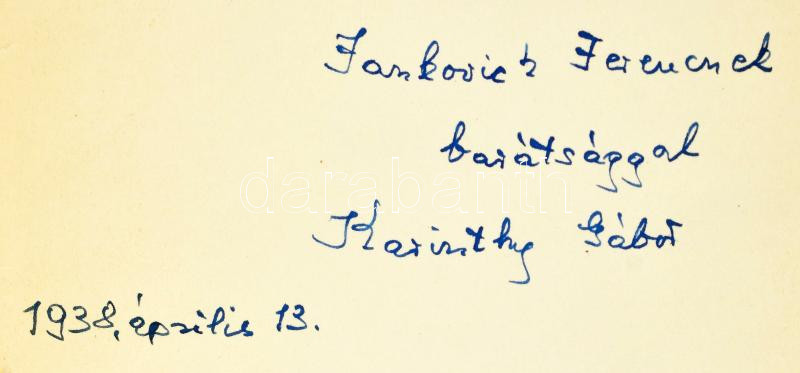 Karinthy Gábor: Étel és ital. Versek. A szerző, Karinthy Gábor (1914-1974) költő által Jankovich Ferenc (1907-1971) Kossuth-, József Attila- és Baumgarten-díjas költő, író, műfordító részére DEDIKÁLT, dátumozott (1938. április. 13.) példány. Bp., 1937, Nyugat,(Haas Ottó-ny.), 76+2 p. Első kiadás. Kiadói papírkötés. Karinthy Gábor (1914-1974) Karinthy Frigyes idősebb fia, Karinthy Ferenc író testvére. Kiváló tehetsége korán megmutatkozott. Barátjával, Devecseri Gáborral 18 évesen verseskötete jelent meg. De kiteljesedni nem tudott, betegsége, skizofréniája egyre jobban elhatalmasodott rajta. Később aztán idegszanatóriumba is került. Barátja, az író Benedek István volt a kezelőorvosa. 1957-től visszavonultan élt. 2019-ben gyűjteményes kötet jelent meg írásaiból, benne számos eddig kiadatlan