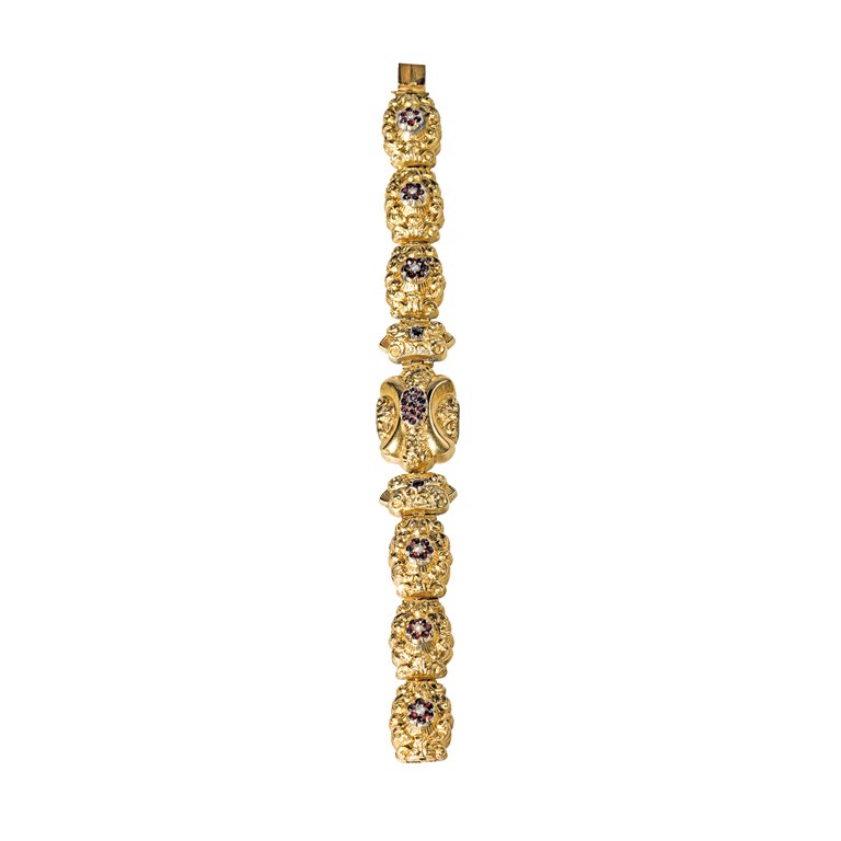 Kikiáltási ár: 85 000 FtBudapest, 1966-1999 közötti fémjel, 14 k arany, Pénzverő készítőjel, 9 db ovális csiszolású narancsvörös rodolit gránát kővel díszítve, nyelves záródással, biztonsági lánccal, 19,2 g