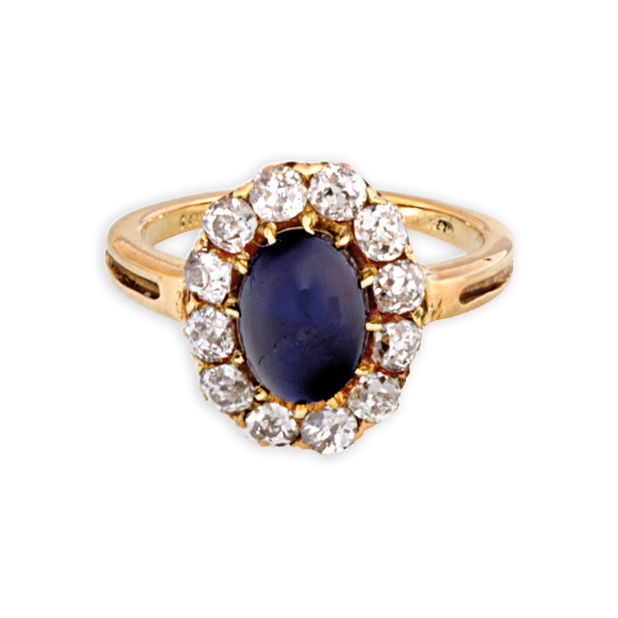Pest(?), 19. sz. vége, elmosódott fémjellel, 14 k arany, karmos foglalatban 1 db mélykék zafír kabuson cca. 2 ct és 12 db régi csiszolású briliáns cca. 0, 6 ct (R2, W-TCr, VS-P1), apró sérüléssel, "Seligmann J. Budapest" jelzetű dobozzal, 3, 6 g