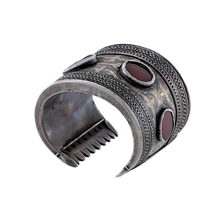 Afganisztán vagy Kazahsztán, 1900 körül, merev ezüst lemez, rátétes, niellós, aranyfestett díszítéssel, 4 db ovális, csiszolt karneol lappal, 162 g; m: 5,8 cm