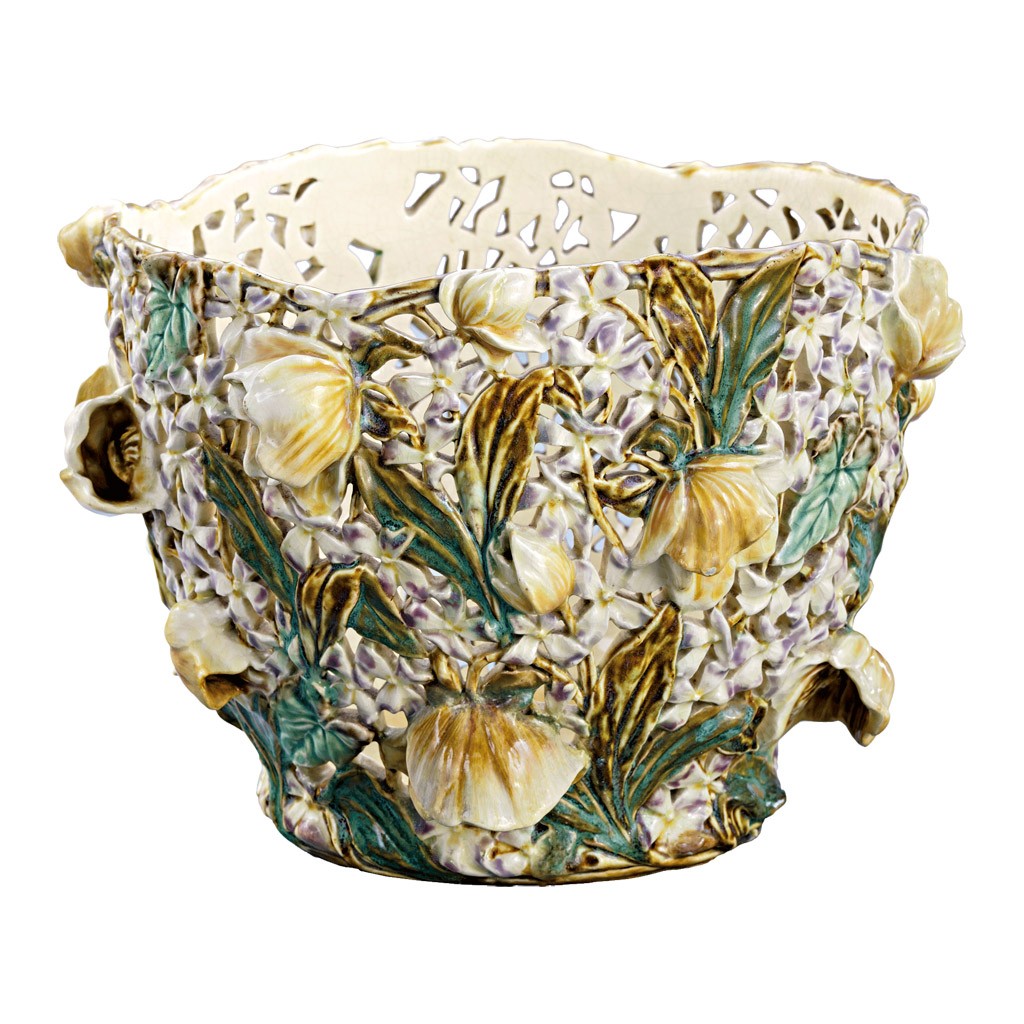 Zsolnay gyár, Pécs, 1900 körül, festett porcelánfajansz, áttört díszítéssel, jelzett az alján: masszába nyomott "Zsolnay Pécs" jelzet, alján kis hajszálrepedéssel, formaszám: 3817