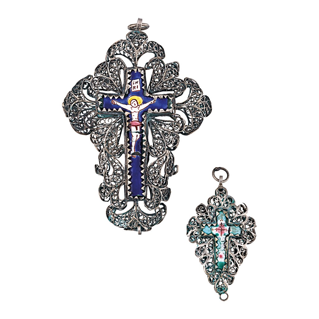 osztrák vagy magyar, 18. sz. közepe, filigrán technika, a nagyobb antik ezüst, a kisebb fém drótcsipkéből formázva, zománc sérült