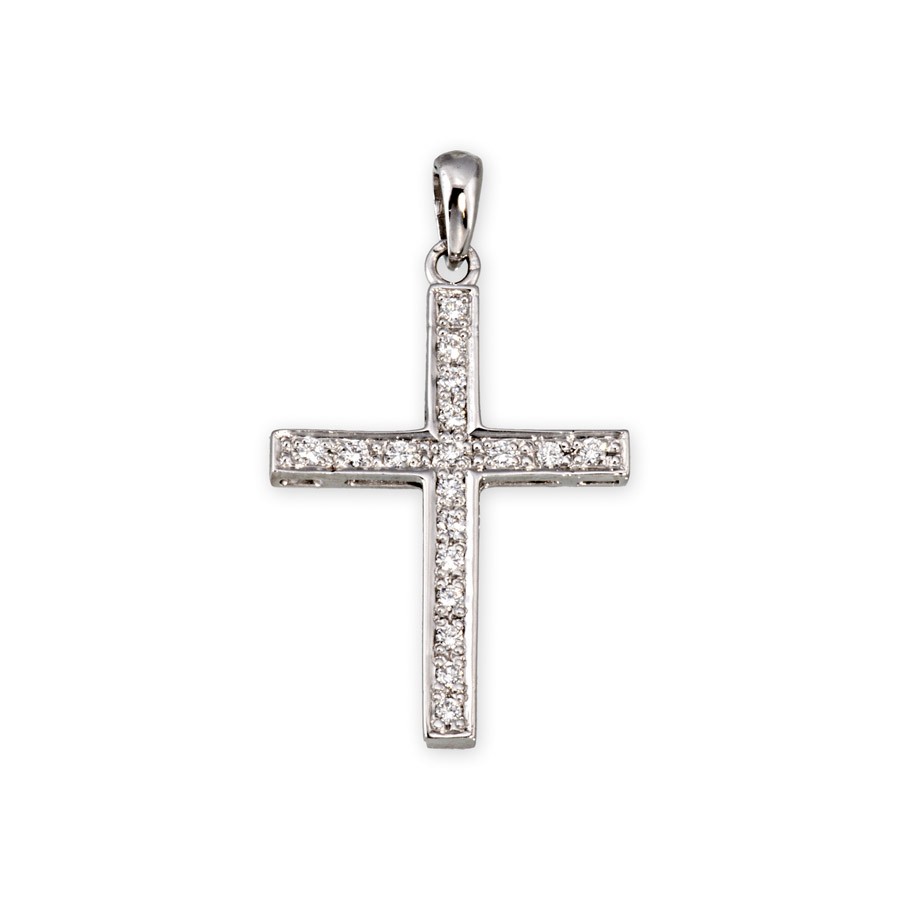 Budapest, 20. sz. második fele, 2005 utáni budapesti fémjellel ellátva, 18 k fehérarany, 18 db modern csiszolású briliánssal cca. 0, 36 ct (M1, W-TCr, VVS), latin kereszt forma, 3, 5 g; h: 3, 8 cm