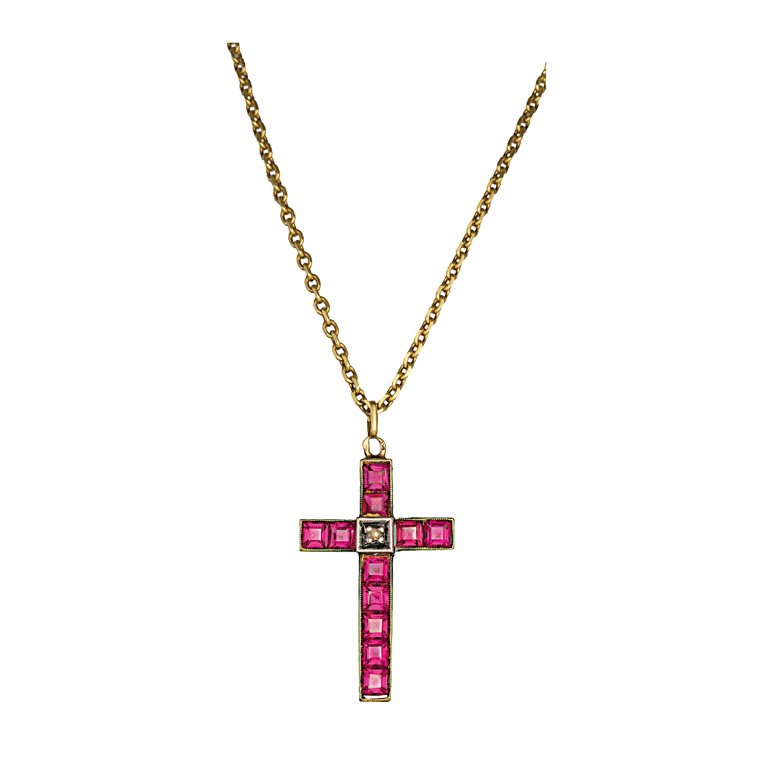 1900 körül, láncon 1902-1936 közötti behozatali jel, hivataljellel ellátva, 14 k arany latin kereszt forma, középen 1 db apró gyémánt szem és 10 db tábla csiszolású szintetikus rubin, 1 db üveg, kőutánzat pótlás, 14 k arany anker láncon, kis sérüléssel, 1