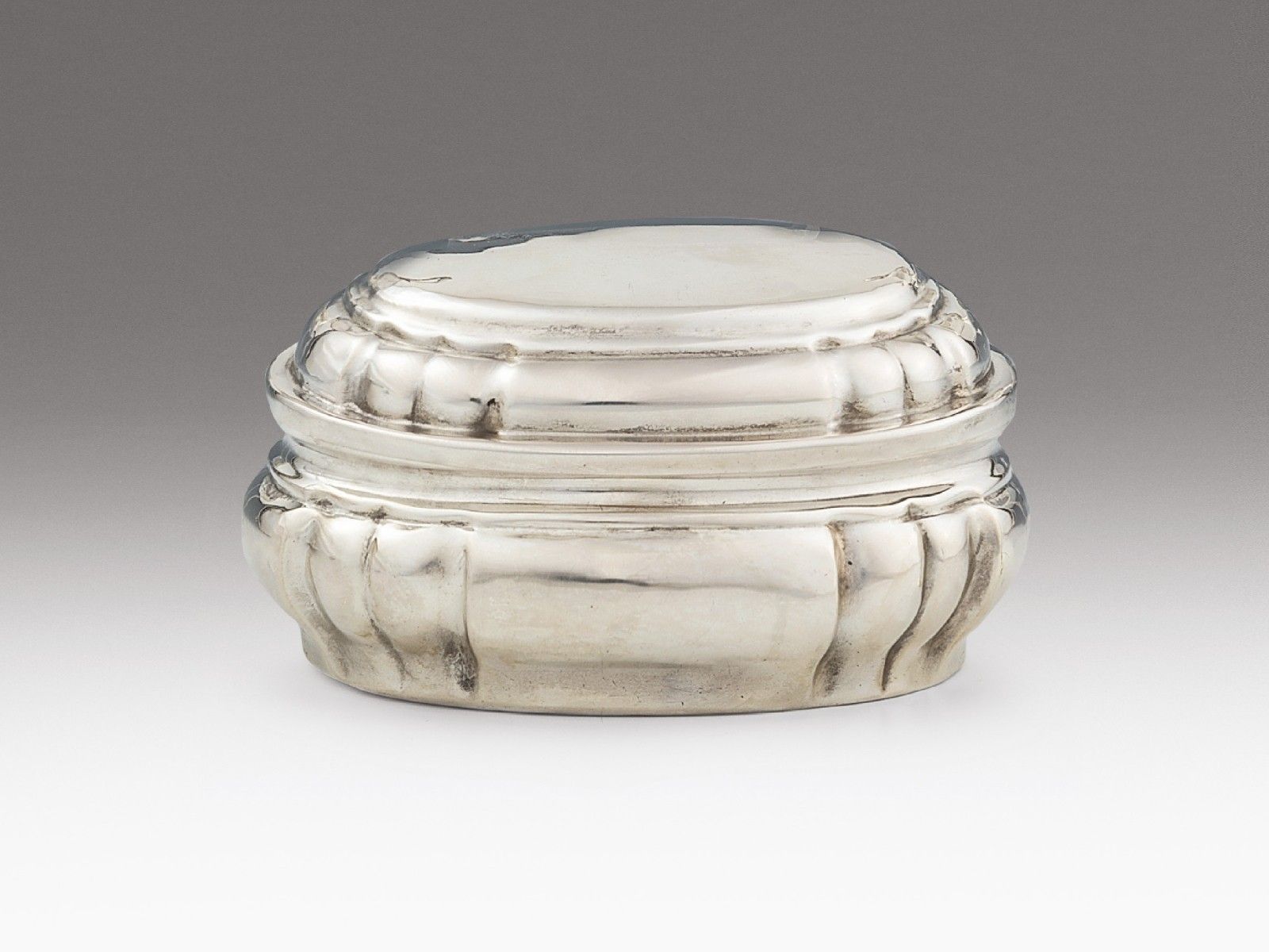 Ezüst, 217 g. Trébelt, karéjosan tagolt ovális forma, leemelhető fedéllel.