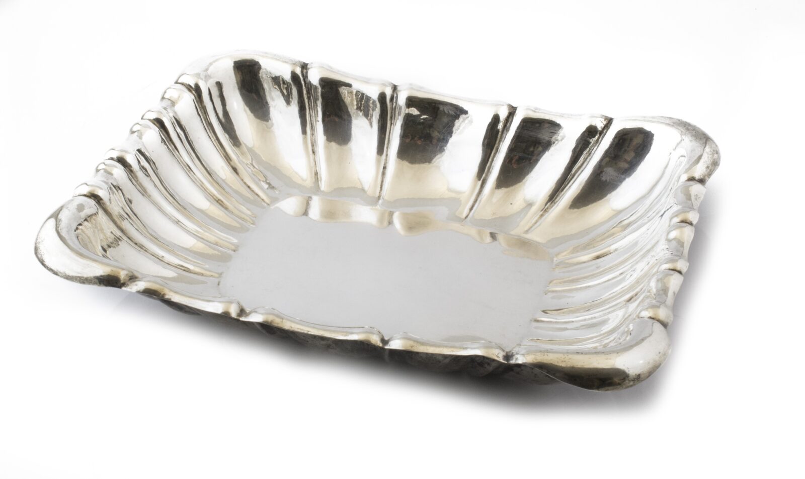 Antik ezüst. Téglány forma, trébelt karéjos peremmel. 1858., Bécs, L.W. mesterjel. Súly: 651 gr. Méret: 27 x 34,5 x 6 cm