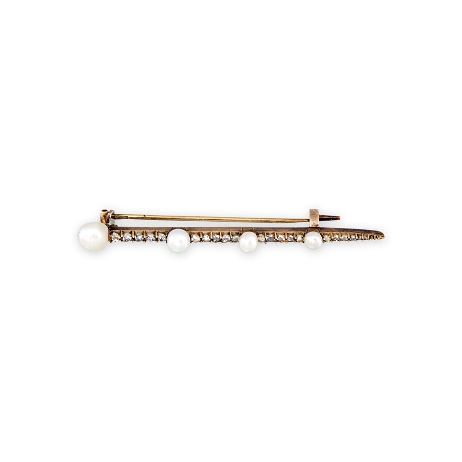 1900 körül, 2006-2015 közötti budapesti fémjellel ellátva, 14 k arany, 2 db természetes és 2 db tenyésztett fehér gyönggyel és karmos foglalatban 21 db hollandi rózsa csiszolású gyémánttal, apró, sérüléssel, 6, 6 g; h: 6, 1 cm