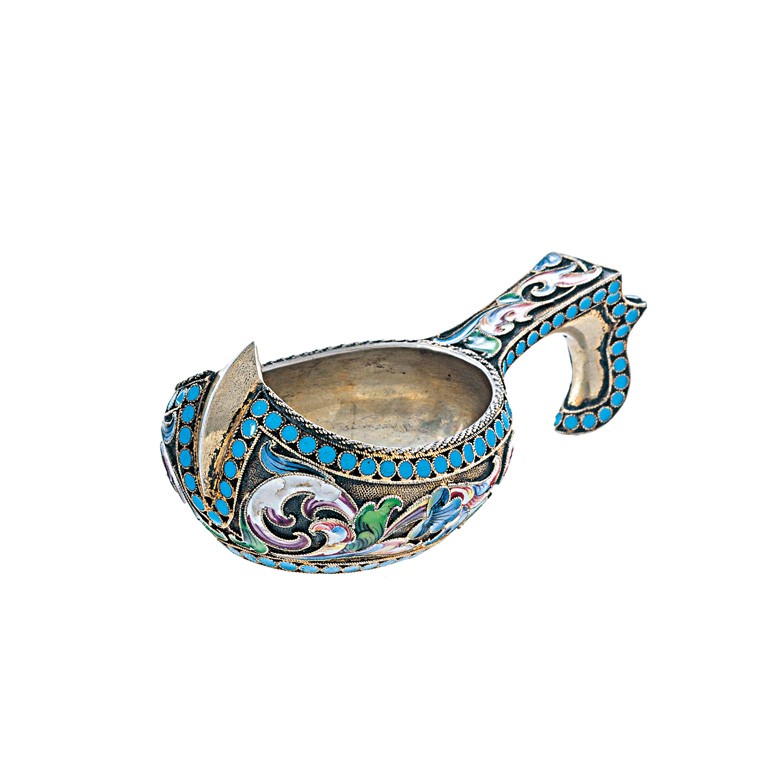 Moszkva, 1899-1905 között, 84 zlotnyikos aranyozott ezüst, Ivan Szaltükov Dimitrijevics mesterjegy, színes, felülfestett rekeszzománc díszítéssel, poncolással, csavart sodronyszálas dekorral, 38,6 g; 2,7*7,5*4 cm