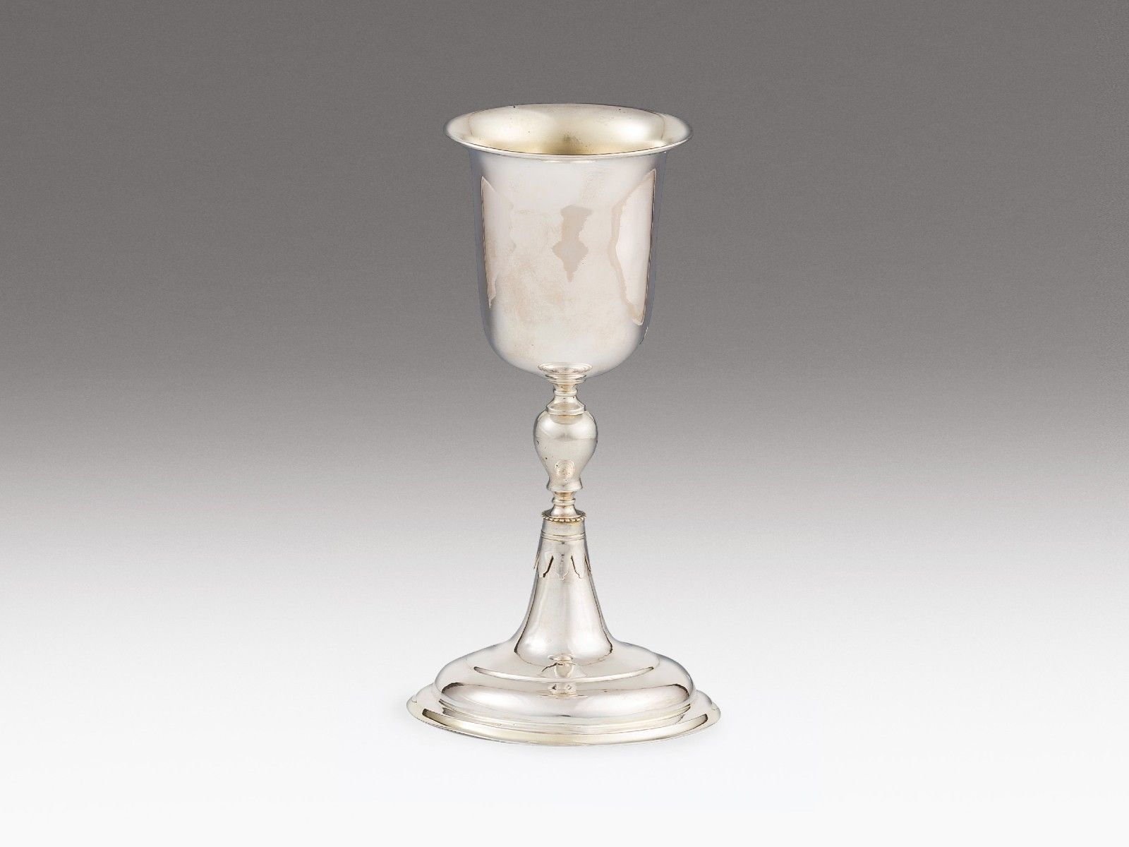Ezüst 381 g., belül aranyozva. Többszörösen tagolt, kerek talpon gyöngysorral és stilizált levelekkel díszített száron öntött nódusz, sima vonalú kehellyel. Peremein tűzaranyozás nyomaival.