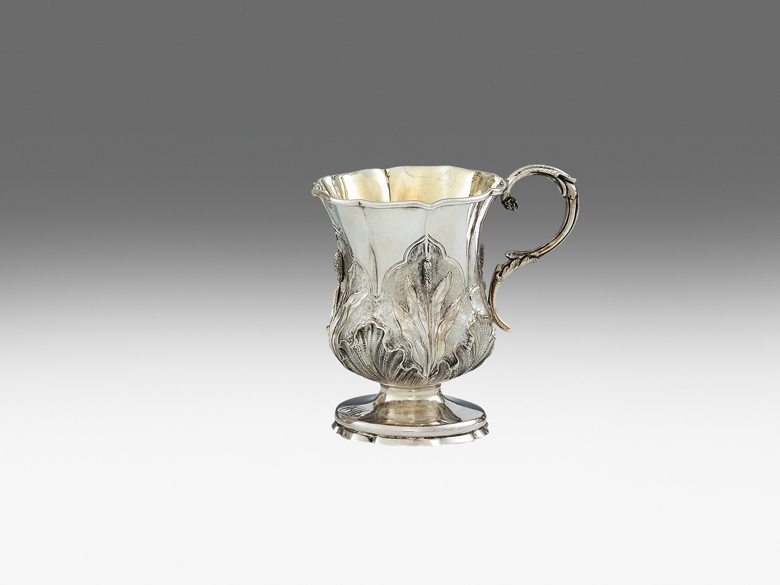 Londoni keresztelőpohár. Ezüst, 191 g., belül aranyozva. Karéjos peremszélű, kerek talpon nyolc részre tagolt, kehely formájú pohár, oldalán öntött, akantuszlevélben végződő csigavonalas füllel. Felületén vésett medalionokban ismétlődő motívumok: poncolt