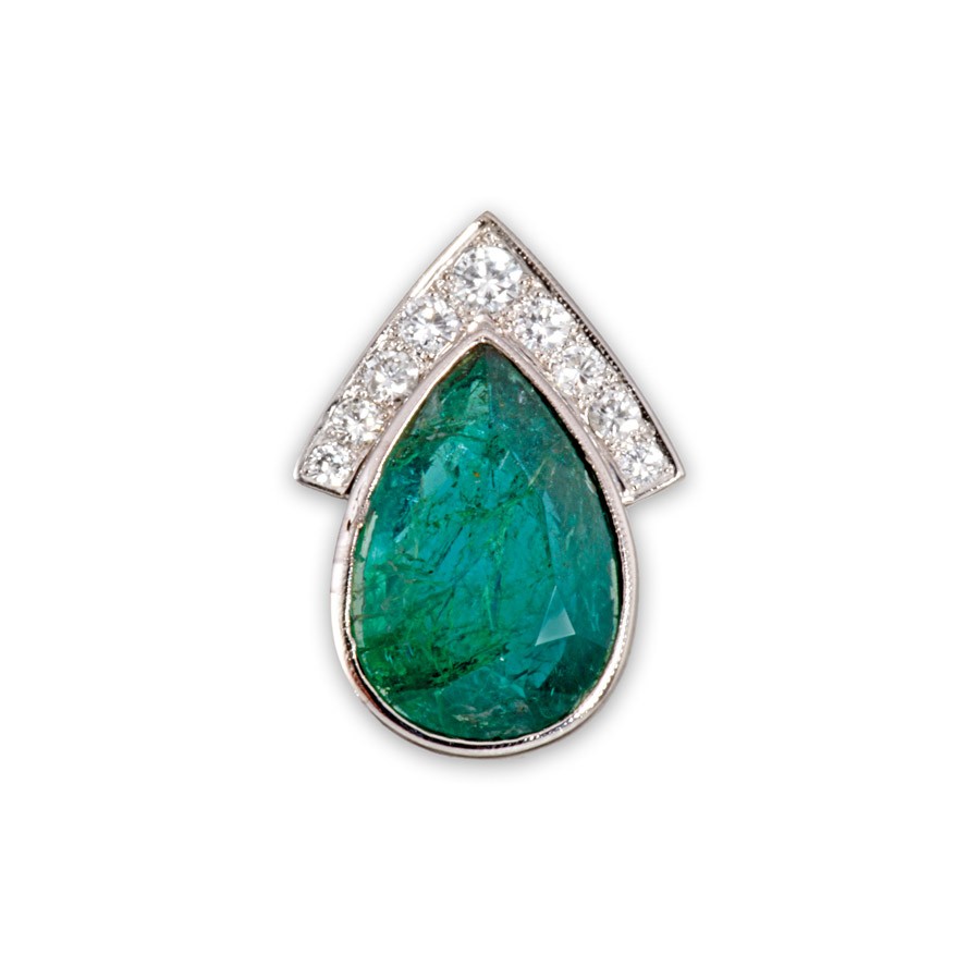 20. sz. vége, 2005 utáni budapesti fémjellel, 14 k fehérarany, 1 db mélyzöld, kolumbiai csepp csiszolású smaragd cca. 10, 9 ct és 9 db modern csiszolású briliáns cca. 1 ct (M1, W-TCr, VVS-SI) ékítéssel, alul kisfelületi hibával, 8 g; h: 2, 5 cm