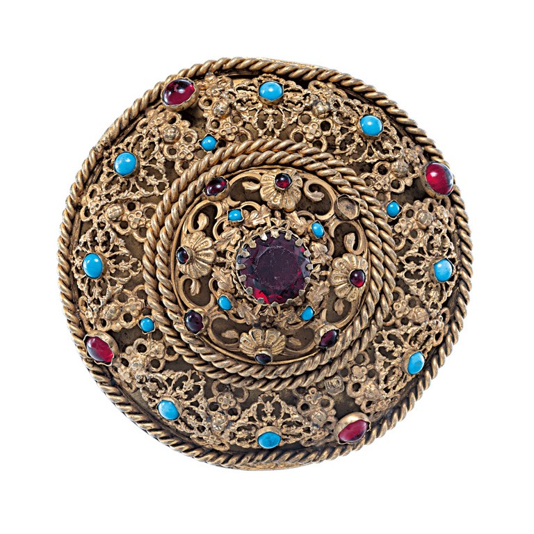 Erdély (?), 19. sz., szász női viseletbe tartozó, sárgaréz lemez, áttört felületén 1 nagy és több kicsi, vörös és türkiz színű kőutánzattal, kis sérüléssel, 1 db vörös kőutánzat hiány, d: 12 cm