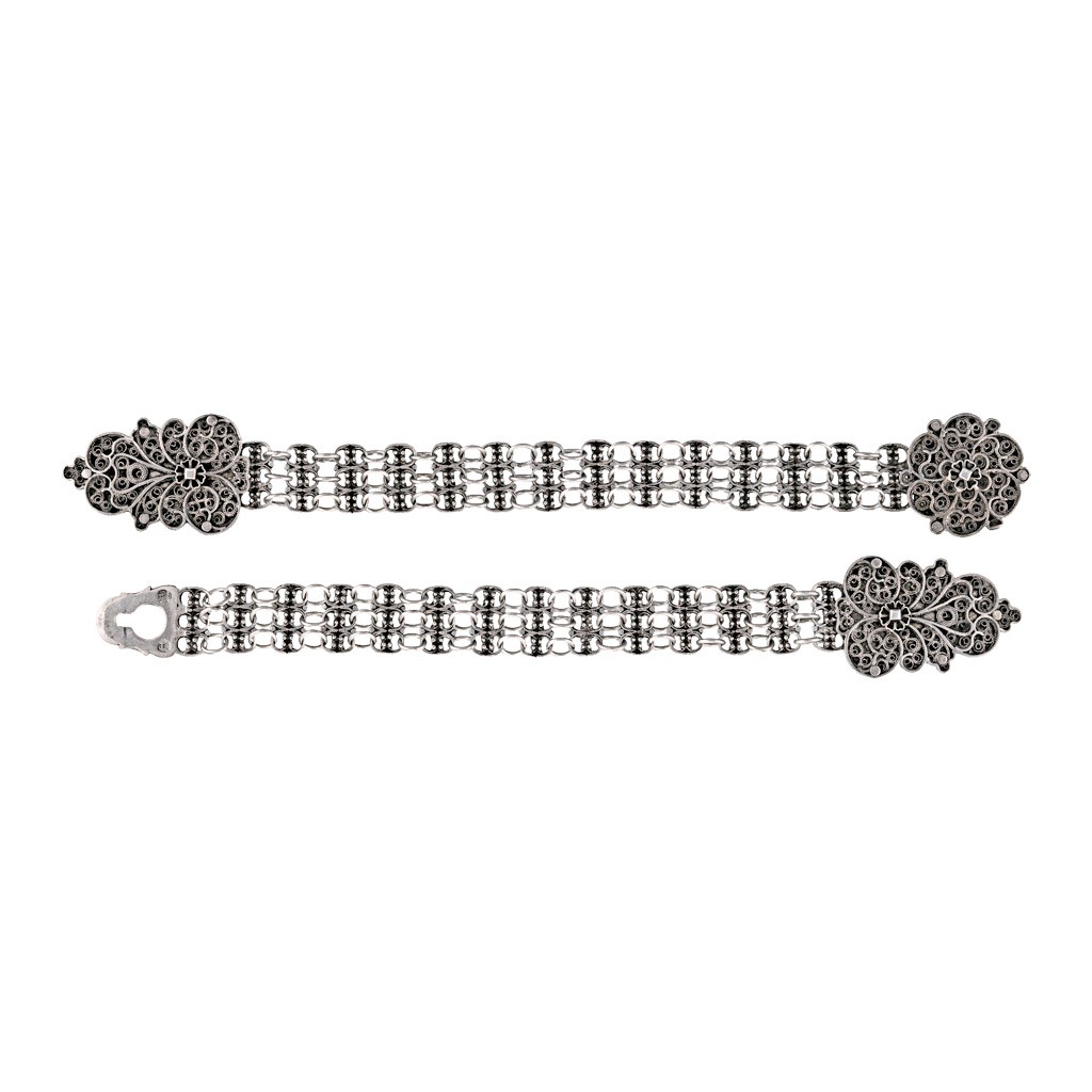 Kikiáltási ár: 280 000 Ft1900 körül, 1902-1937 közötti pesti behozatali jellel, 14 k arany, fehérarany szalagokkal lemezelve, Garai és Szeghő mesterjegy, 4 db ónix színű kőutánzattal, nyelves záródással, biztonsági nyolcassal, Latzko Testvérek Ékszerészet dobozával, apró hibával,
