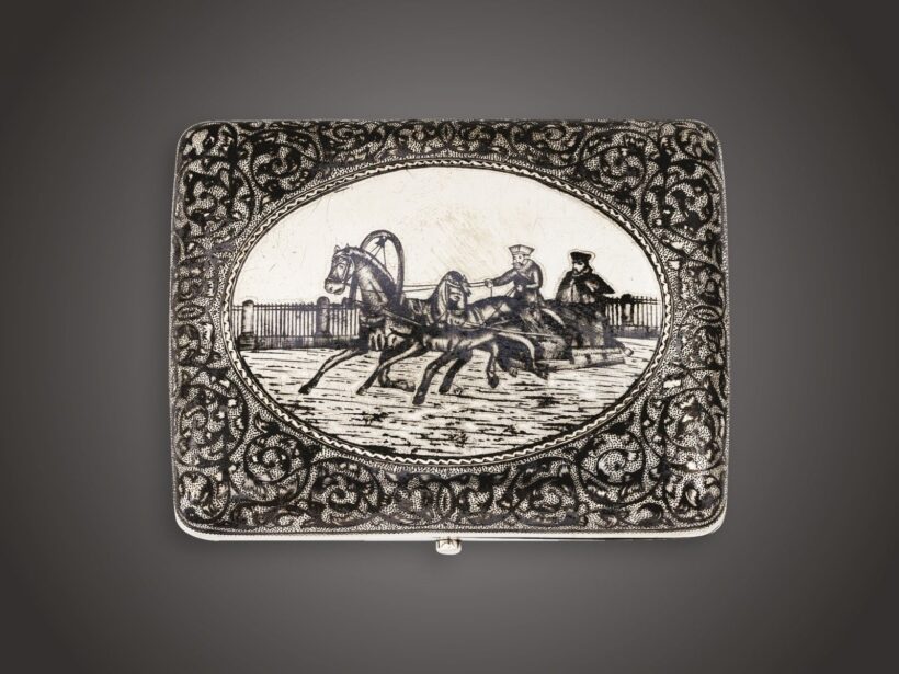 Ezüst, 115 g., belül aranyozva. Téglalapforma, felületén niellós díszítéssel, nyomógombos nyitódással. Zsanéros fedelén ovális medalionban lovasszán.
