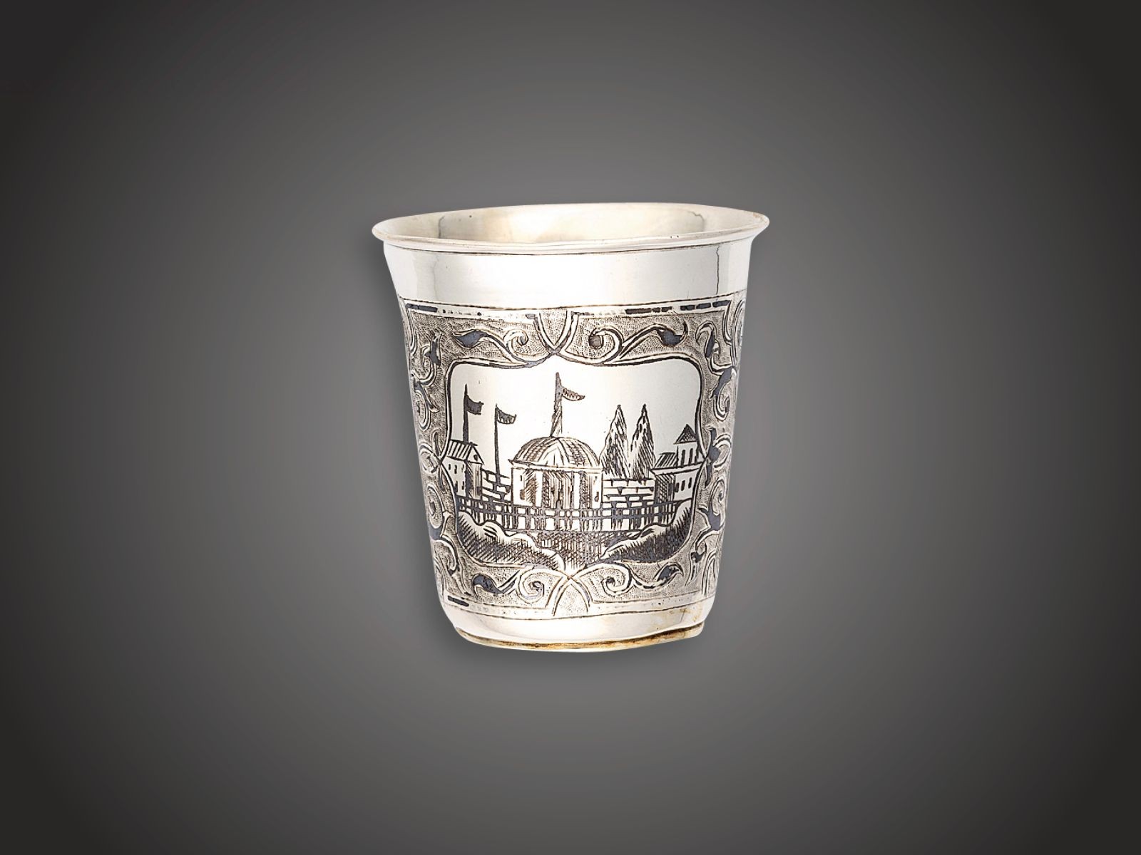 Kikiáltási ár: 40 000 FtEzüst, bruttó 195 g. Négy lábon álló piskóta formájú tálka, peremén áttört díszítéssel. Belsejében üvegbetéte alatt virágdíszes gyöngyfűzés. Oldalán jelzett: Igló, 1840 körül, Antonius Umlauff. M.: 22 × 9 × 3 cm