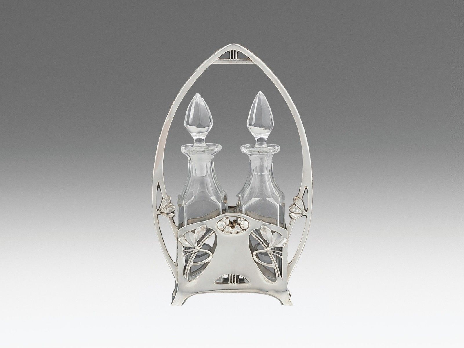 Ezüst, 130 g. Áttört felületén préselt és vésett, szecessziós leveles-bogyós, indás díszítmények, középen ívelt fogó. Fúvott és csiszolt, színtelen üvegbetétekkel (egyik palackja pótlás).