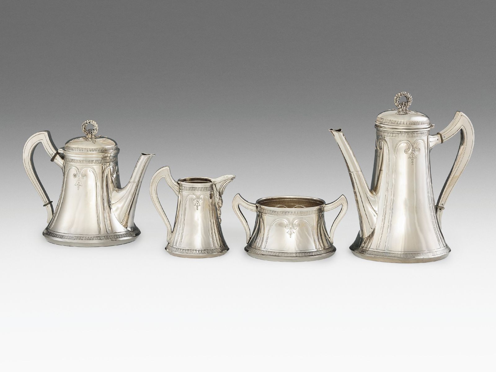 Ezüst, 1510 g. Két darab teáskanna, cukortartó és tejkiöntő, belül aranyozva. Felületén vésett historizáló díszítmények: peremeken