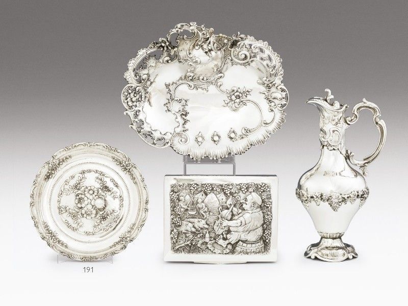 Kikiáltási ár: 30 000 FtEzüst, bruttó 195 g. Négy lábon álló piskóta formájú tálka, peremén áttört díszítéssel. Belsejében üvegbetéte alatt virágdíszes gyöngyfűzés. Oldalán jelzett: Igló, 1840 körül, Antonius Umlauff. M.: 22 × 9 × 3 cm