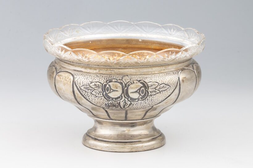 Ezüst, bruttó 629 g., belül aranyozva. Kerek forma, oldalán bécsirózsás díszítménnyel. Fúvott és csiszolt, színtelen üvegbetétje pótlás. Jelzett: Pest, 1920 körül. M.: 12,5 cm; átm.: 18,5 cm