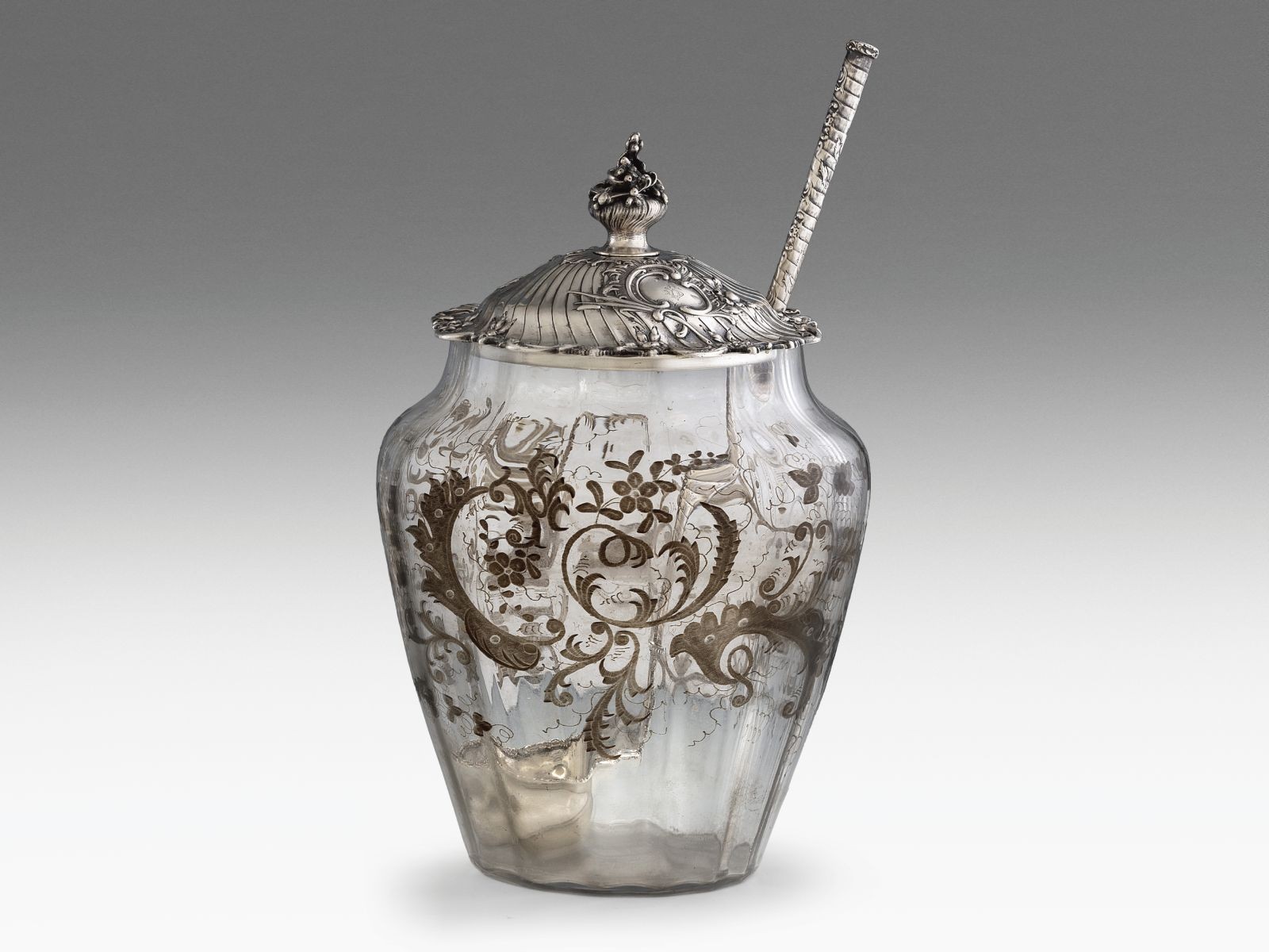 Ezüst, 375 g. Fúvott, optikailag díszített, köszörült üveg felületén schwarzlot festéssel. Bordázott díszítésű ezüst fedelén rokokó_x000D_