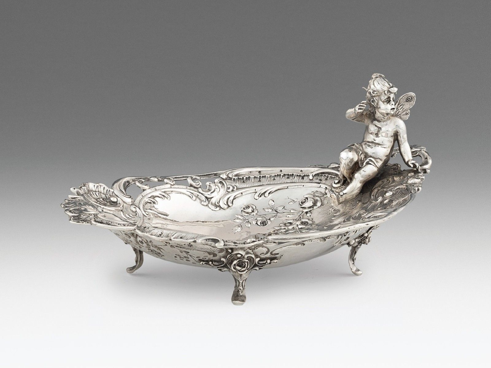 Ezüst, 533 g. Stilizált, bécsirózsás lábakon álló ovális tál, peremén öntött és cizellált szárnyas puttóval. Áttört, legyezőkagylókkal és rokályokkal díszített tál öblében domborított, poncolt és vésett virágcsokrok.