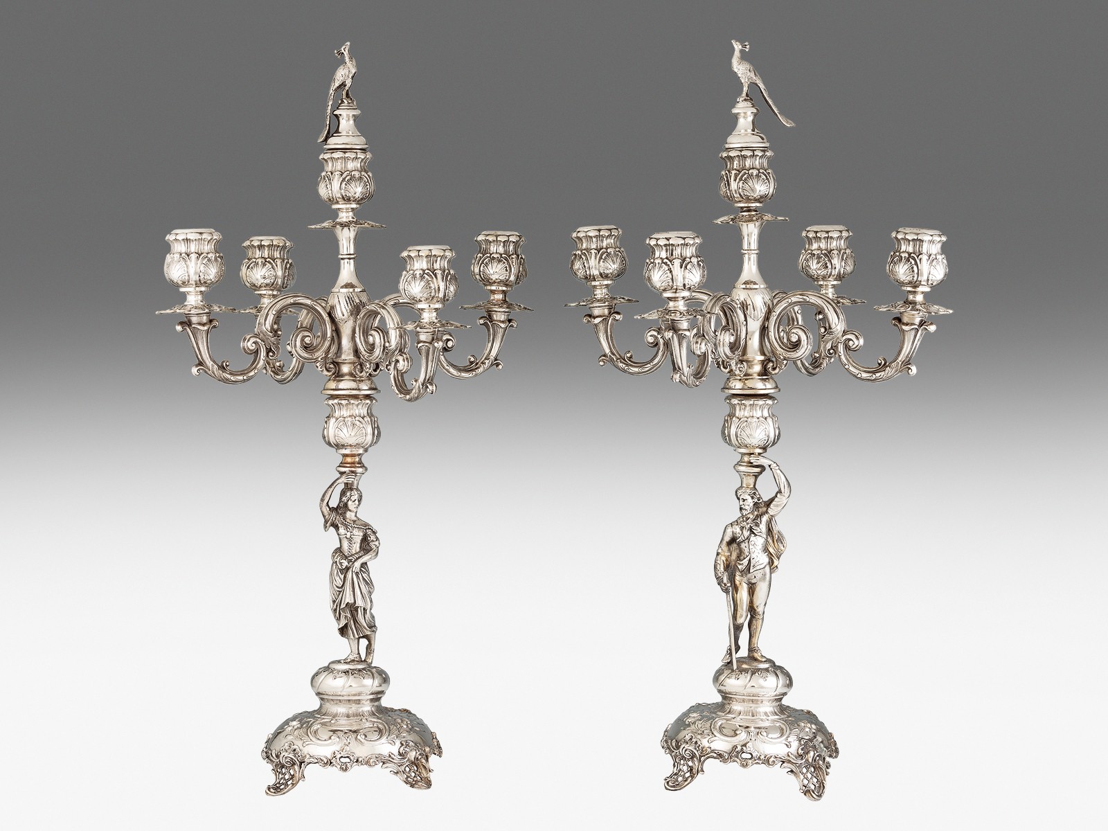 Ezüst, 2972 g. Áttört, rokályos lábakon álló, boltozatos kerek talapzaton öntött és cizellált osztrák népviseletbe öltözött férfi és nőalak, fejükön legyezőkagylóval díszített gyertyacsészével. Rajta kivehető, ötégős gyertyatartó indásan hajló karokkal.