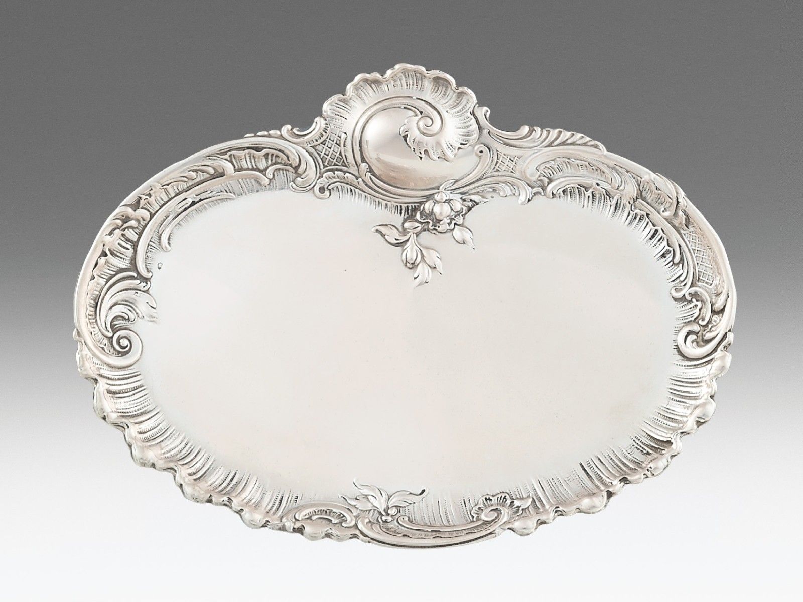 Ezüst, 300 g. Ovális forma, peremén domborított, poncolt és vésett rokokó díszítmények.