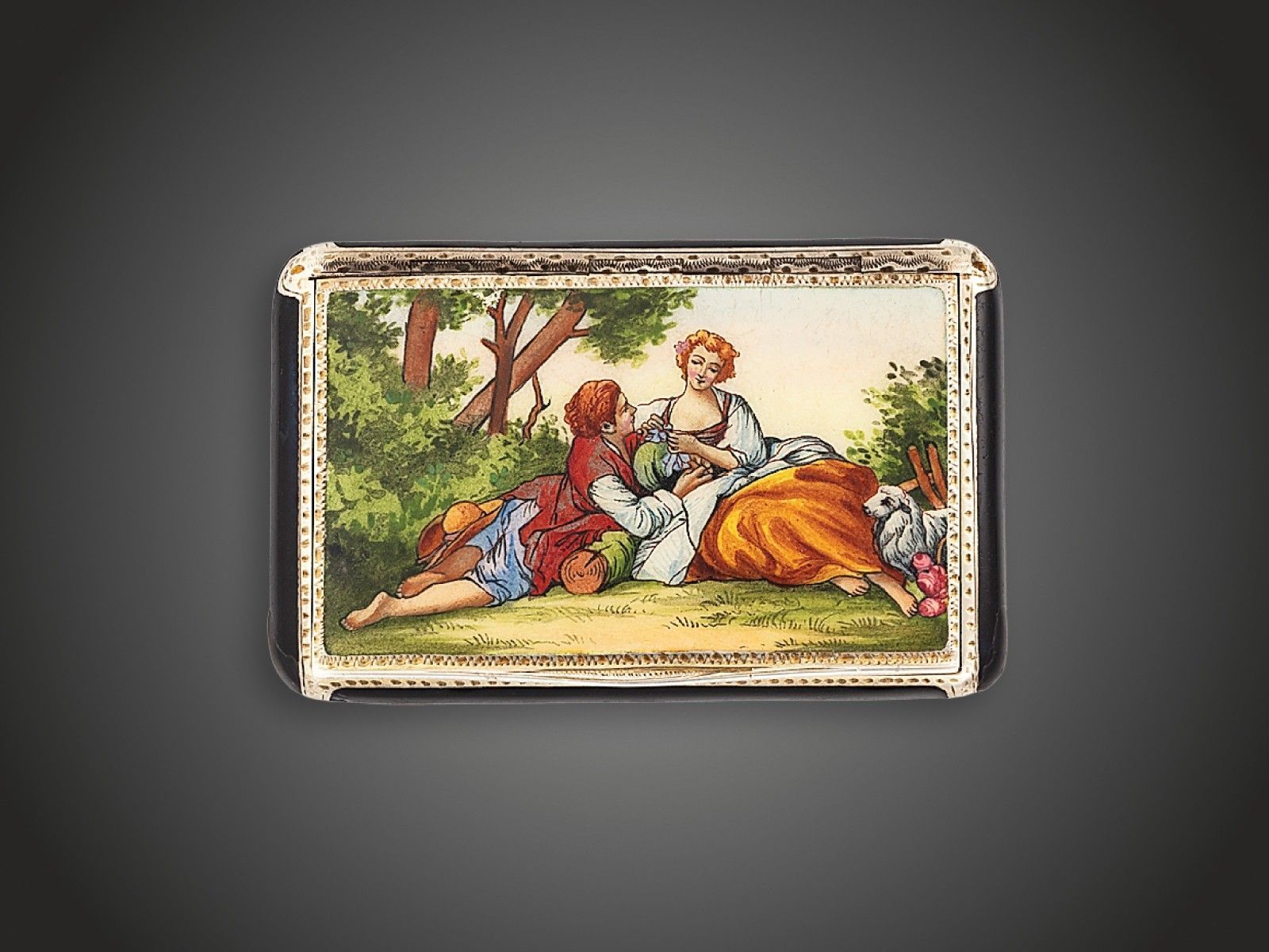 Ezüst, 137 g., belül aranyozva. Sarkain lekerekített téglatest. Zsanéros fedelén vésett keretben színes zománccal festett udvarlási jelenet. Alján fekete zománccal festett. Zománcon apró csorba és kisebb javítások. Kopott.