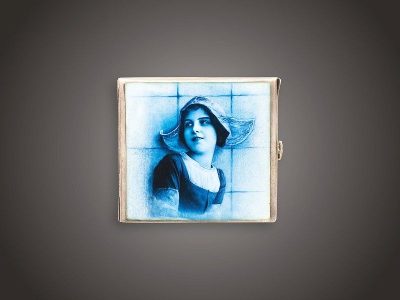 Ezüst, 134 g., belül aranyozva. Négyzetforma. Zsanéros nyitódású fedelén gilosált alapon transzlucid és kék-fehér zománccal festett