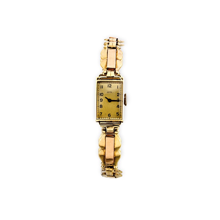 Svájc, 1940 körül, 1937-1966 közötti budapesti fémjel, 14 k arany tok, szíj és csat, hivataljel és "SzA" mesterjegy, arab számos, percbeosztásos számlap, jelzett: Ormo, tokszám: 286690, nyelves zárral, biztonsági nyolcassal, működik, kis sérüléssel, Btto: