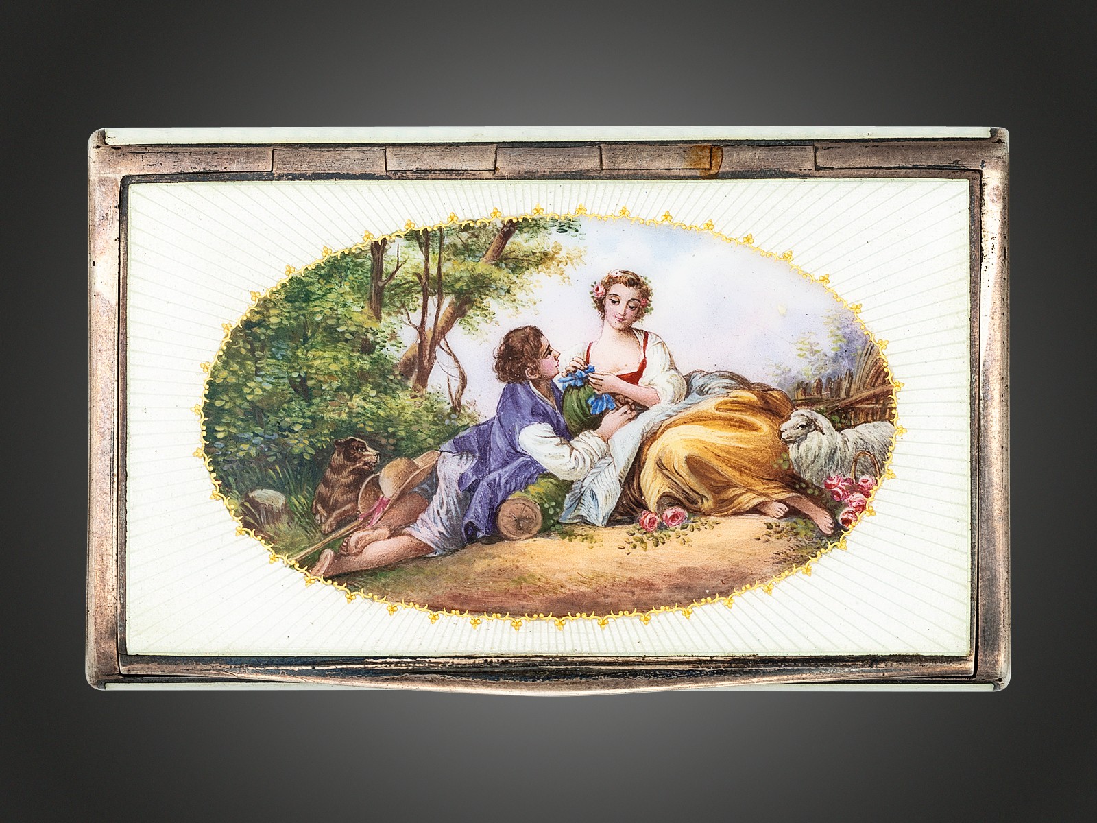 Ezüst, 151 g., belül aranyozva. Felületén gilosált alapon fehér transzlucid zománc. Zsanéros fedelén aranyozott keretelésű ovális medalionban romantikus jelenet: évődő pásztorlegény kedvesével színes zománccal festve. Belsejében ajándékozási véset. Jelzet