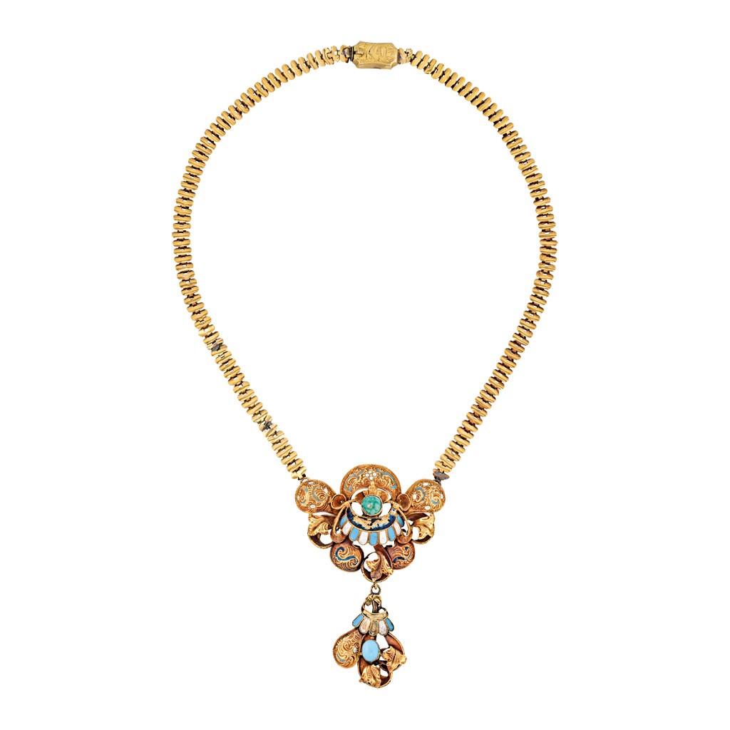 Kikiáltási ár: 160 000 FtPest (?), 1867-1936 közötti fémjel, 14 k vörös- és sárgaarany walles típusú lánc, "BS" mesterjegy, nyelves záródással, biztonsági nyolcassal, apró hibával, 58 g; h: 19,5 cm