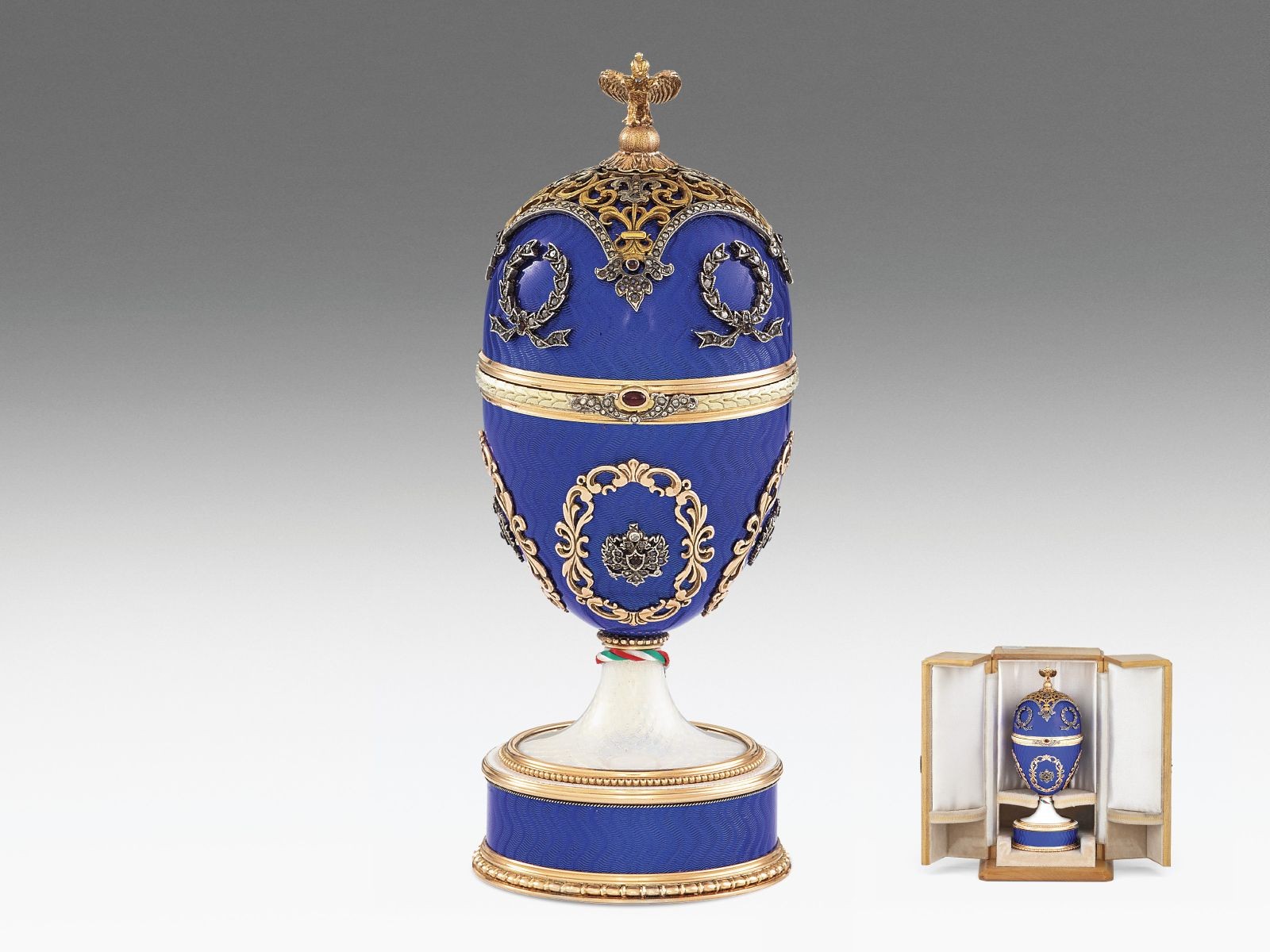 kővel ékítve. Gilosált alapon transzlucid fehér és királykék zománcfestéssel, nyitható szerkezettel. Belsejébe