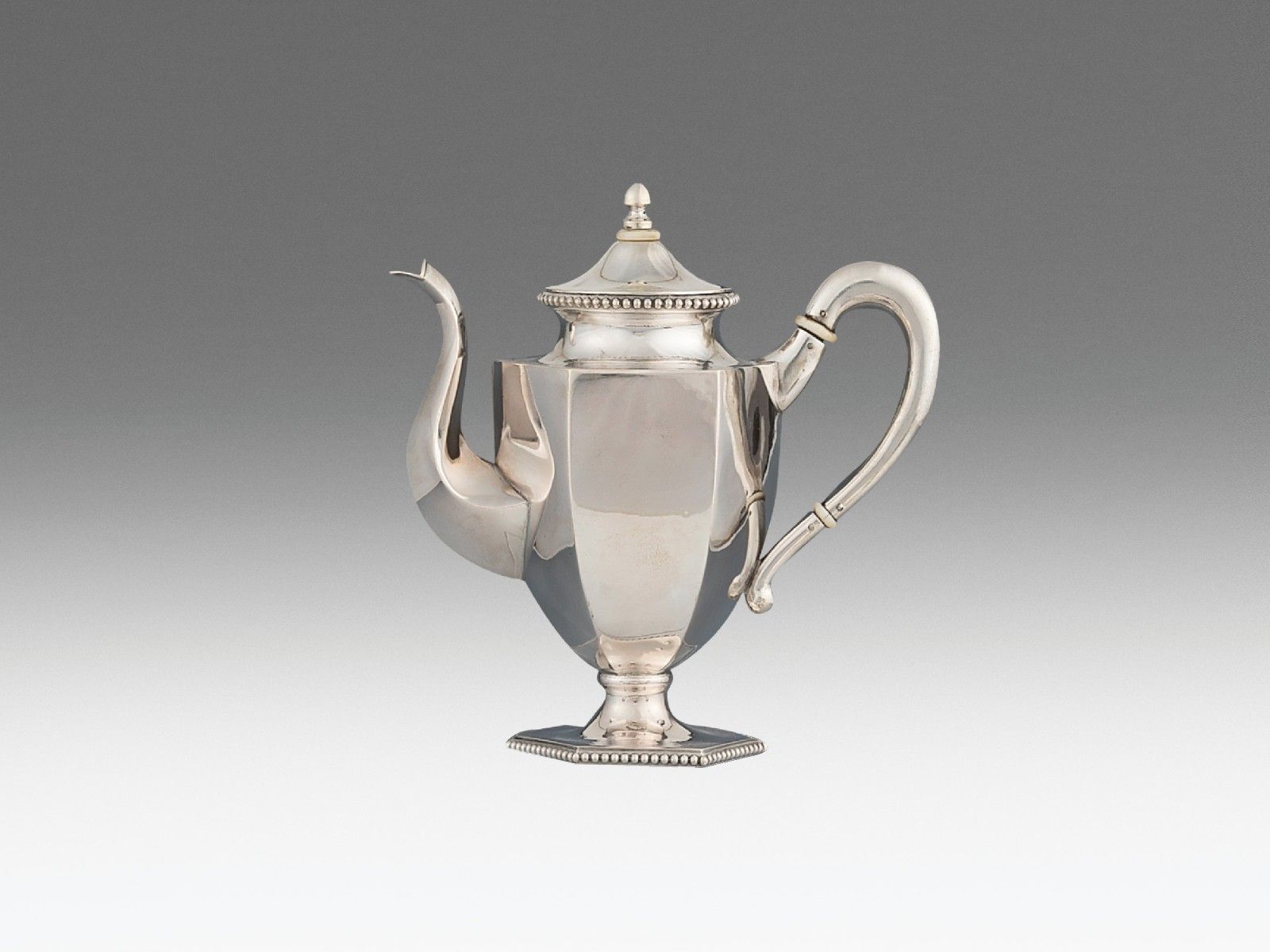 Ezüst, 367 g. Hatszögletű talpon bordázott díszítésű edény, ívelt kiöntőcsőrrel és füllel. Zsanéros fedelén és fülén csont szigetelőgyűrűk. Peremein gyöngysordísz.