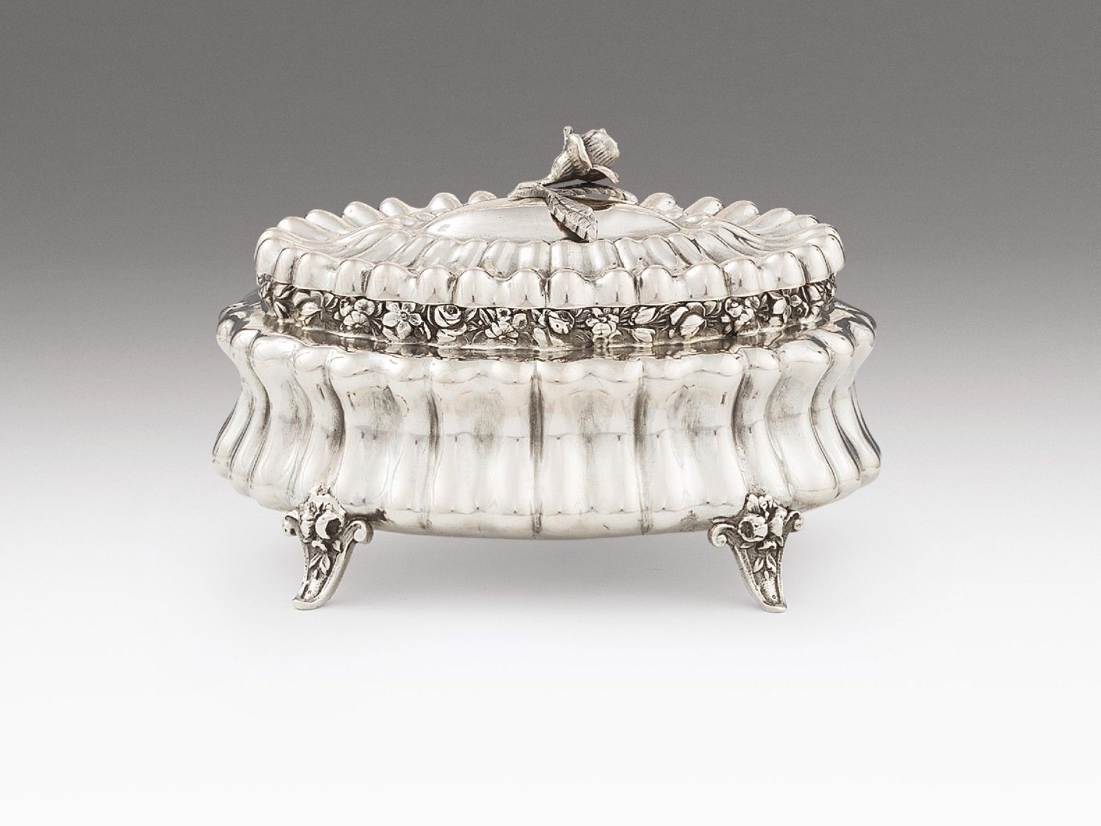 Ezüst 474 g., belül aranyozva. Négy stilizált lábon álló, bordázott díszítésű ovális edény. Zsanéros fedelén öntött és vésett rózsa.